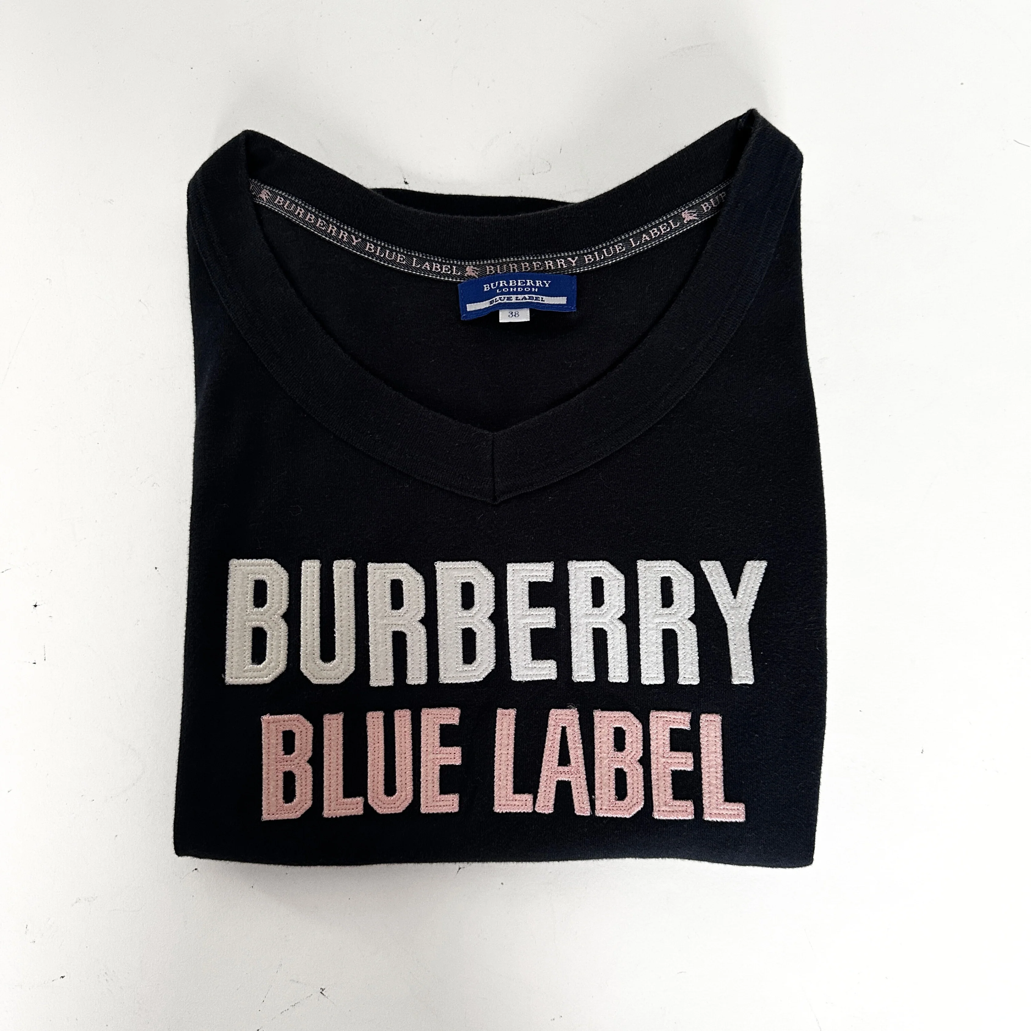 Burberry Logo T-shirt made of Cotton. This t-shirt is in size 38. This t-shirt can be perfectly combined with jeans or a skirt. This t-shirt can also look nice underneath a blazer. The overall condition of this t-shirt is good.