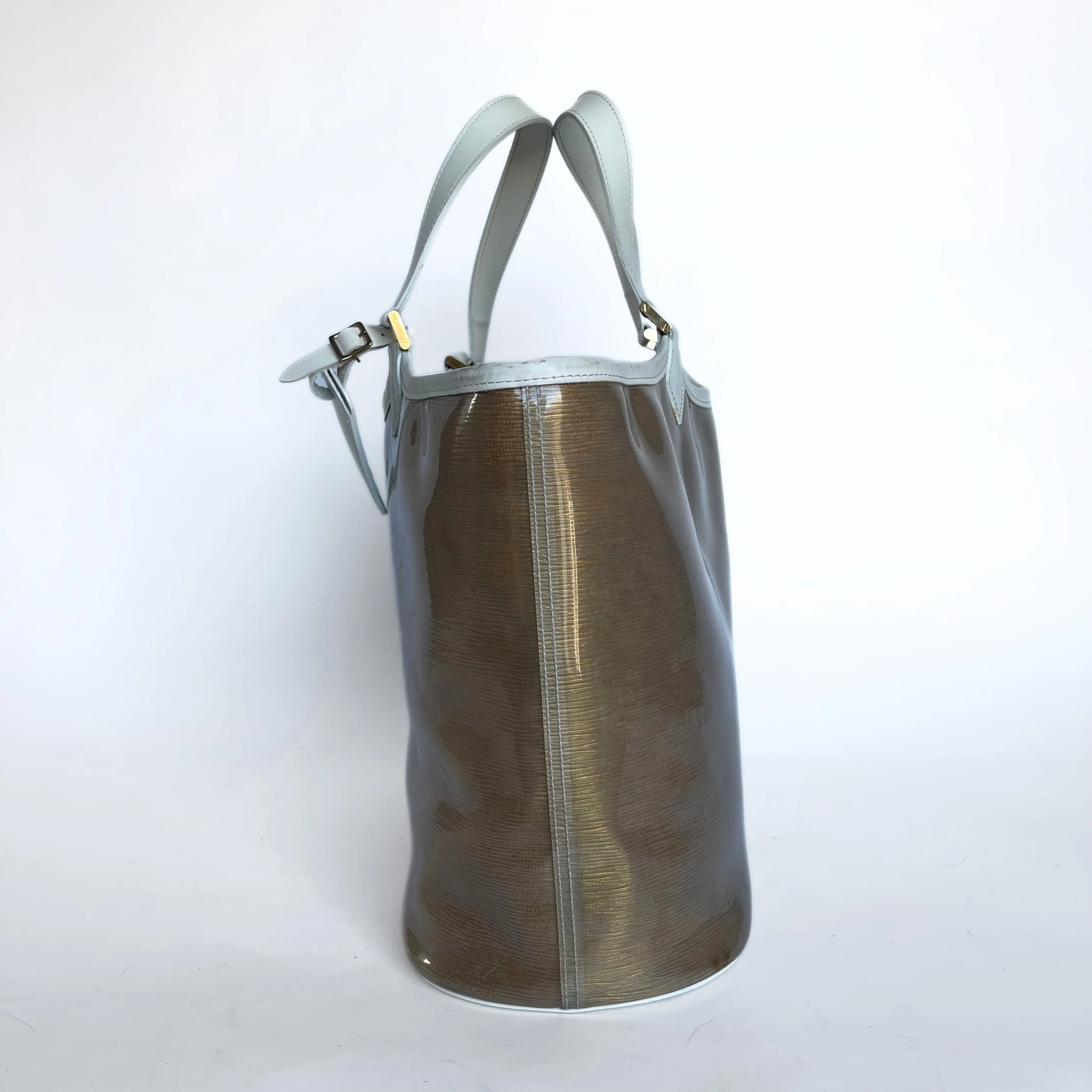 Louis Vuitton Epi Place Lagoon Bay Bag in Gold Vinyl. The bag has leather handles and gold-colored hardware. This unique bag was produced in Spain 2003 and is no longer made. With its classic shape and roomy capacity, it is perfect for taking to the office or going shopping. You won't want to leave home without it!